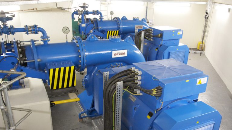 The hydro generation equipment was designed, manufactured and installed by Gilkes. There are two horizontally shafted Francis type turbines directly coupled to two 415 volt, three phase synchronous electrical generators. The turbine is controlled by a et of 20 guide vanes mounted in the spiral casing which direct the water onto the runner, causing it to rotate at 1000rpm to drive the generator. After passing through the turbines the water is discharged down through the draft tube into the tailrace pipe and back into the river through a special fish friendly screen.