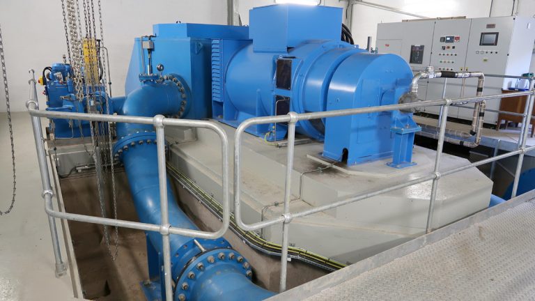 The faster running nature of the Turgo, along with its broad efficiency characteristics and low profile, all fitted well with the scheme’s hydrology and planning constraints. The scheme has two intakes, the main intake being located on a dam formerly owned by Scottish Water, from which the scheme only abstracts when the dam spills. The second intake is a conventional run of river intake which highlights the importance of the Turgo’s flat efficiency curve.