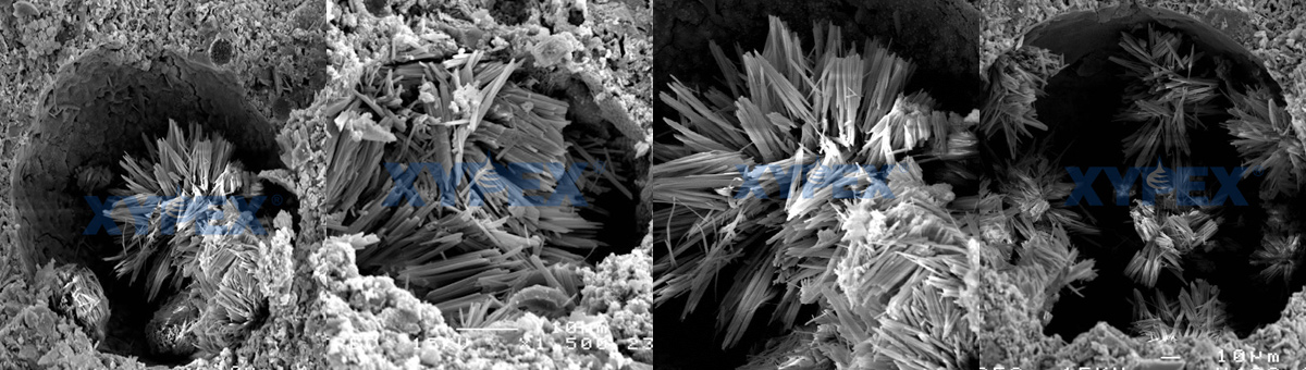 Our SEM images show conclusively that the many and varied Xypex non- soluble crystalline structures formed within the concrete are unique, and truly have … NO EQUAL.”